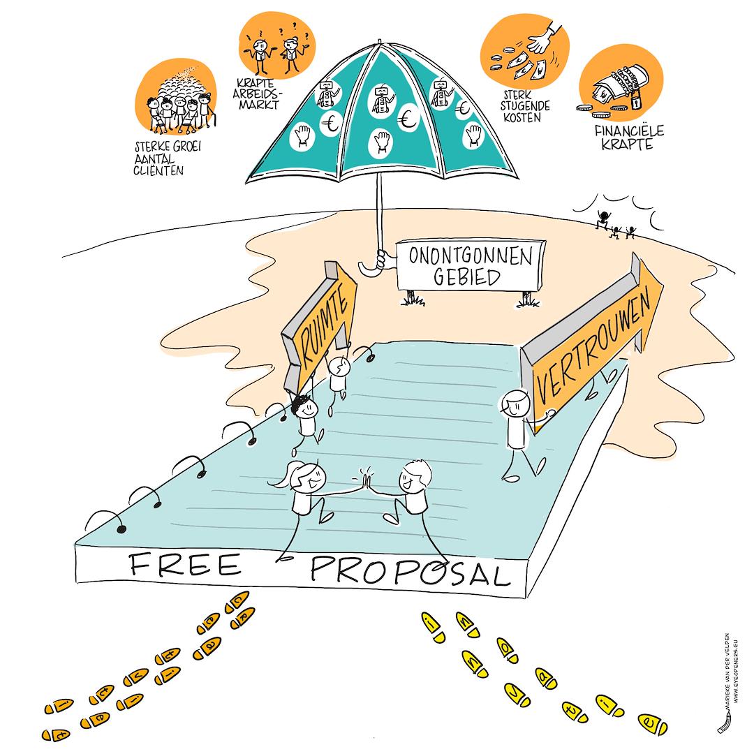 U verleent toestemming om gedurende de looptijd van het Free proposal opgedane kennis en ervaring vanuit de uitvoering van het plan met derden te delen. In overleg bepalen we gezamenlijk voor welke andere partijen deze informatie relevant is en met welke deze gedurende het proces gedeeld wordt.