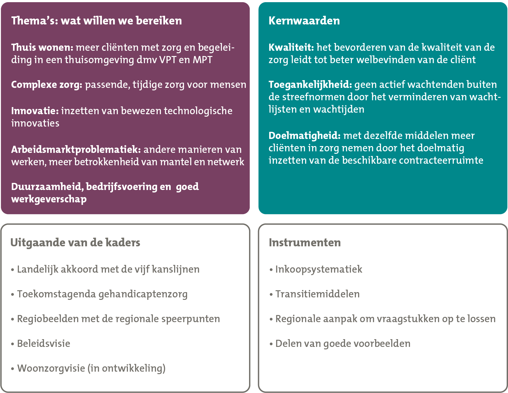 Ter ondersteuning van deze samenwerking hebben we voor iedere regio een regiobeeld (new window) opgesteld. Het regiobeeld is een verzameling van cijfermatige inzichten en kwalitatieve gegevens van de gehandicaptenzorg in de regio. De data zijn met veel zorgvuldigheid in beeld gebracht en geven inzicht in de zorgvraag, de betaalbaarheid en de toegankelijkheid van de gehandicaptenzorg. Naast cijfers zijn in de regiobeelden ook kwalitatieve gegevens over de regio opgenomen die verkregen zijn vanuit signalen, dialogen en locatiebezoeken. We hebben met elkaar gesprekken gevoerd, afspraken gemaakt en ook zijn er oplossingen gevonden. Niet voor elk vraagstuk is direct een oplossing te vinden. Daarom staan ook de regionale opgaven beschreven waar wij in gezamenlijkheid met zorgaanbieders aan werken. Dit doen we vanuit de gezamenlijke verantwoordelijkheid om de zorg ook in de toekomst goed, betaalbaar en toegankelijk te houden.