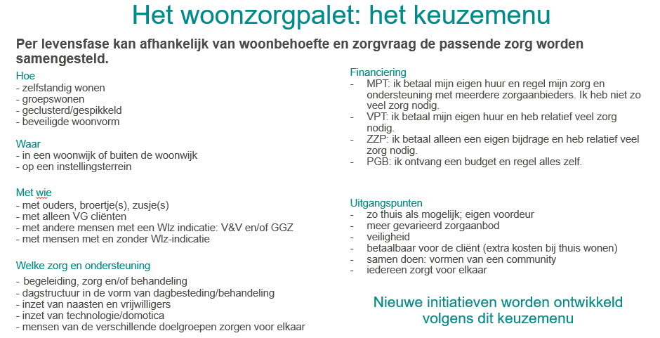 We hebben dit samengevat in een conceptversie van een woonzorgpalet. Deze geeft aan welke keuzemogelijkheden er allemaal zijn om per levensfase tot een passende zorginzet te komen.